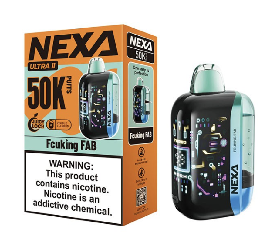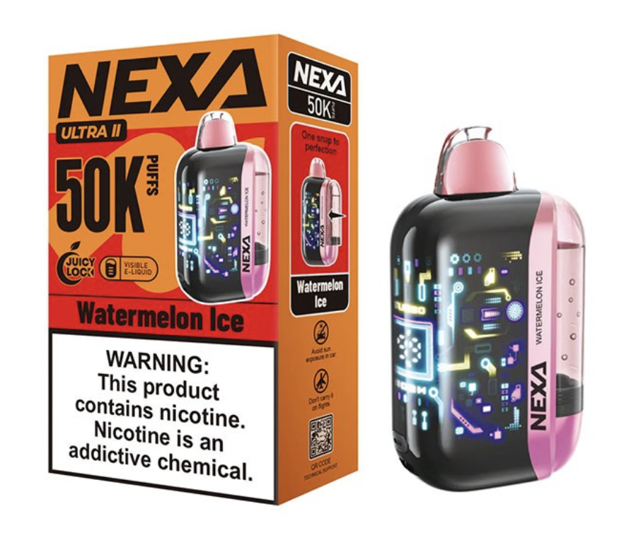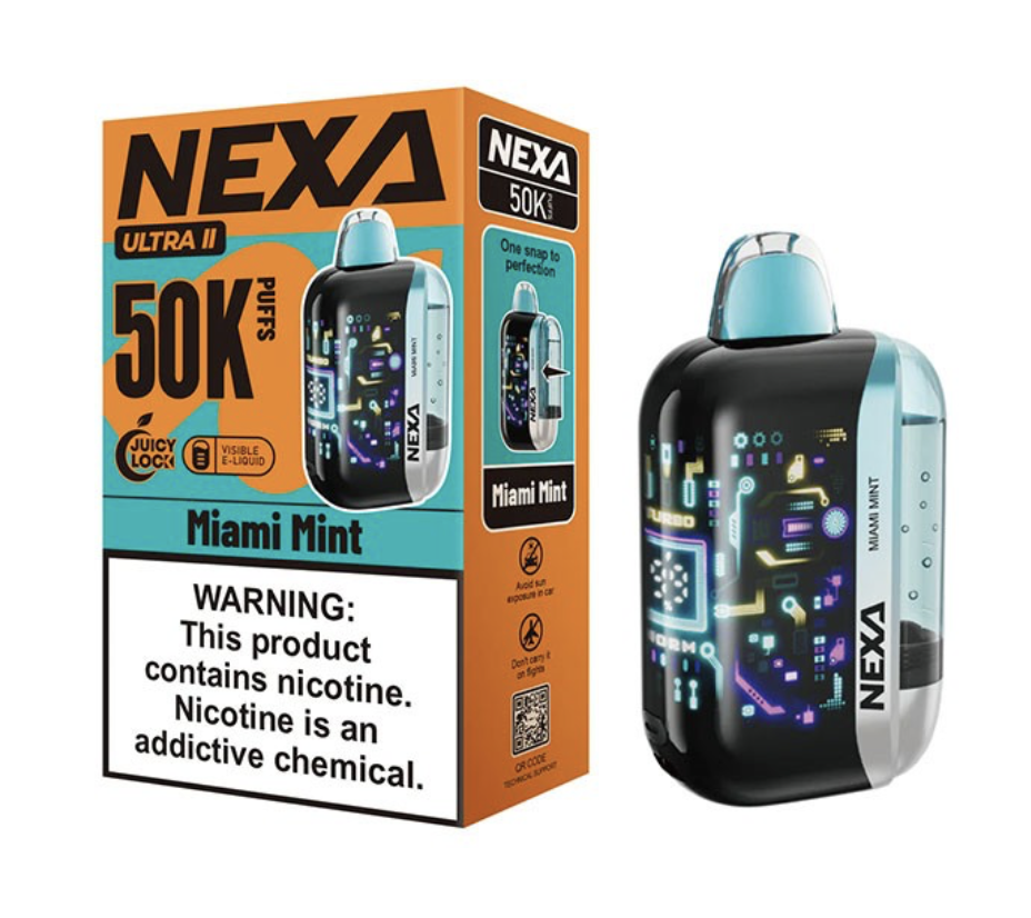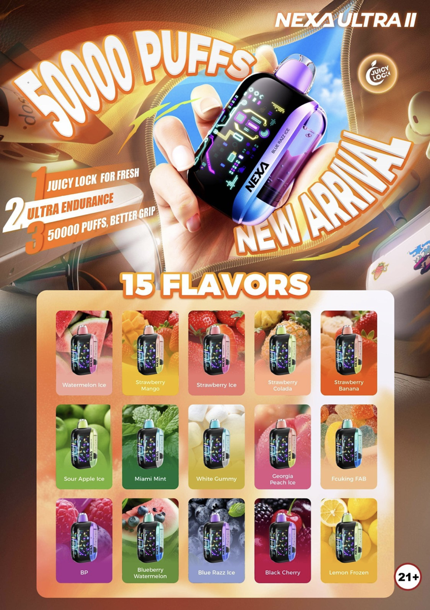 The NEXA ULTRA 50k II builds on the original design with a smaller body and the updated Juicy Lock system—first introduced with the PIX 35k—to prevent leaks and keep flavor consistent. It holds 20 mL of e-liquid, powered by a 900 mAh rechargeable battery with dual mesh coils and two power modes. Now with a stealth mode for discreet vaping, and available in 15 flavors, with more to follow.