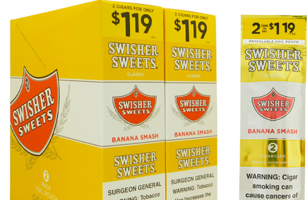 Swisher Sweets Cigarillos Banana Smash is back for a limited time! Experience a zesty blend of banana and strawberry flavors infused in premium blended tobaccos. Packaged in individual resealable foil pouches, they are designed to stay fresher longer and taken wherever you go. With the sweet combination of flavors and sensuous aroma, Swisher Sweets Banana Smash Cigarillos are the perfect cigarillo to enjoy any time of day.