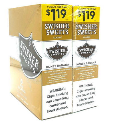 Swisher Sweets Cigarillos Honey Banana is an exciting new flavor from Swisher Sweets! Featuring all natural tobacco enhanced with the essence of sweet honey and fruity banana. This unique combination is creamy, sweet and mild bodied, a perfect combination to enjoy any time of day. Two Swisher Sweets Cigarillos Honey Banana are sealed in foil pouches to maintain freshness and available in boxes containing 30 pouches.