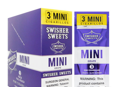 Swisher Sweets is one of the most popular machine made brands. They offer a wide variety of cigarillo flavors that are sure to please every smoker's palate. Swisher Sweets Mini Cigarillos Grape is infused with a delicious burst of grape that hits you every time you take a puff. These mini cigarillos are compact with an easy draw, making them the perfect little treats that can be smoked anytime. You might want these treats for a special occasion or to relax after a long day. Swisher Sweets Mini Cigarillos Grape smells so delicious that you are hit with the grape flavor before even smoking one! They are made from select tobacco blends that result in a mild, sweet and aromatic smoke. They are sold in 15 re-sealable pouches with 3 cigarillos in each pouch. They measure inches in length with a ring gauge of 28.