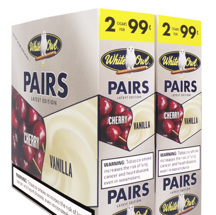White Owl Pairs Cherry & Vanilla is the newest pair flavoring from White Owl released in 2022. It combines the best of two irresistible flavors, delicious sweet cherries and creamy, light vanilla. Made with premium tobacco fillers and wrapper and crafted with the high quality you expect from the White Owl brand. White Owl Pairs Cherry & Vanilla are packaged with two cigars each in resealable foil pouches that maintain the cigars freshness and aroma. Each cigarillo measures 4 5/8 x 28. This limited edition flavor won't be around for long so grab them while you can.