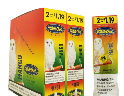 White Owl Cigarillos Mango feature a refreshing blend of fruity mango flavor infused in all natural tobacco fillers and a homogenized wrapper. These mild bodied cigarillos are both delicious and aromatic. Two cigars are packaged in resealable foil pouches to ensure maximum freshness, making them perfect to take anywhere you go. White Owl Cigarillos Mango measure 4 5/8 x 28 and are available with two cigars in each.