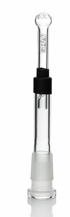 The 14mm GRAV® Adjustable Downstem can extend anywhere from 4" to 6" and is compatible with any 14mm beaker or straight-based water pipe with an angled joint. The two halves of the downstem are held together by a custom fitted segment of heat shrink tubing. Its tri-cut showerhead diffuses smoke through water, and its adjustable length is perfect for any amount of water.