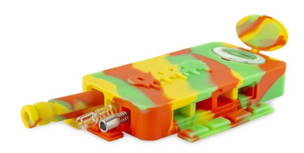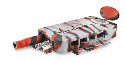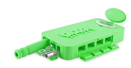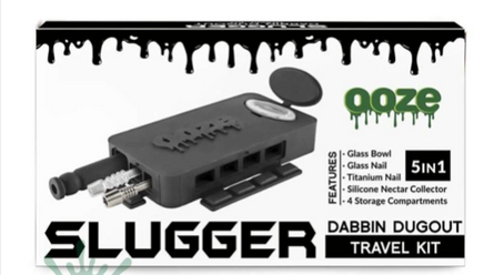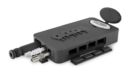 The Slugger Dabbin' Dugout is an all-in-one kit that keeps your concentrates neat, tidy, organized, and accessible anywhere. It packs up into a flat, rectangular shape that really does not look like it's a smoking accessory, and especially not a complete dab rig. The main component of the Slugger is the body, which is a storage system that houses all the smaller parts, and is used to dab out of. It includes a silicone dab straw, a glass nail, a titanium nail, and a small glass dish on the top to dab out of. You can store up to 4 different strains of wax in the storage slots along the side. Assemble the dab straw by inserting one of the nails into the end of the straw. Heat the nail with a torch (not included), and then dab right out of the glass dish.