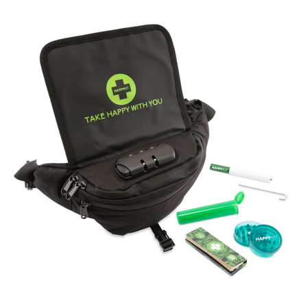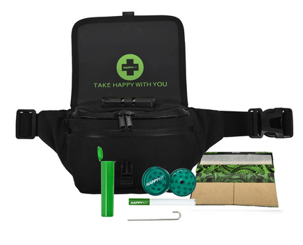 Get happier than ever with the Happy Pack Display from Happy Kit! Each case has a netting texture that gives it some grip, and the carbon lining keeps all the odors locked tightly inside when all zipped up. This fanny pack travel kit is all-in-one, but still has some room inside for extra accessories and tools. There are two zippered pockets on the front to keep tools separated, and the larger pocket is extra secure with a 3-digit lock. The backside also features a hidden pocket with a covered zipper. The one-hitter pipe is an old-school style piece that is basically a mini chillum pipe. Designed to resemble a cigarette with a green filter, the metal pipe has a small bowl on the very end. Pack it full and take one hit just like the name says. It’s easy to stash away in an instant. Lift the flap of the pouch and use the underside as a rolling tray. Break the bud down with the plastic grinder and roll up a joint with a filter. The kit also includes a metal poker tool to clear a clogged bowl, and a plastic joint tube to protect the roll until it’s time to smoke.