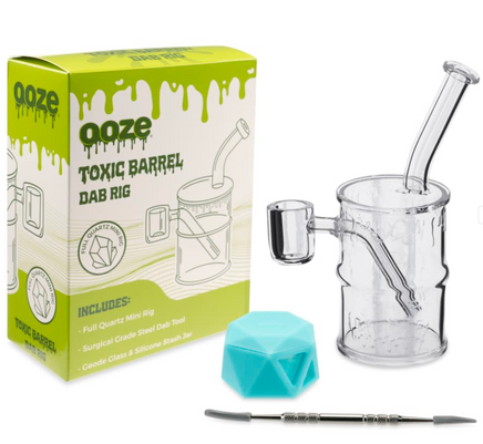 The Toxic Barrel Mini Rig is Ooze’s first all-quartz dab rig! It has a small stature that is comfortable to hold and improves the flavors of the dabs it produces. This mini rig includes a quartz banger, bubble carb cap, surgical steel dab tool, and Geode stash jar to hold concentrates. Quartz handles heat very well, so this rig is great for cold-start and low temperature dabbing.