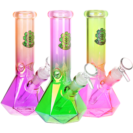 The SeshGear Diamond Base Beaker Glass Water Pipe has colorful, ombre borosilicate glass with a green SeshGear logo on the neck, just above the 3-pinch ice catcher. The pipe includes a removable slitted diffuser downstem for water filtration and a 14mm male funnel style herb slide with a rod handle. Measures 7.75 inches (19.7cm) tall.